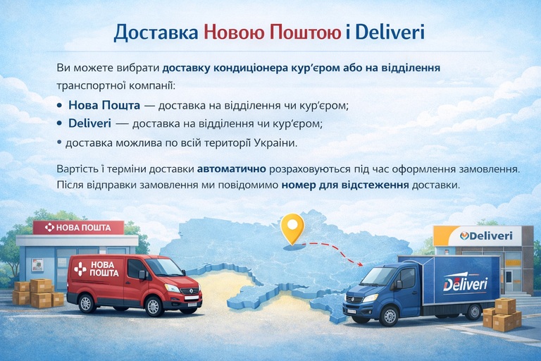 Ми доставляємо кондиціонери по Україні зручними транспортними службами. Під час оформлення замовлення ви можете обрати відповідний спосіб отримання товару.